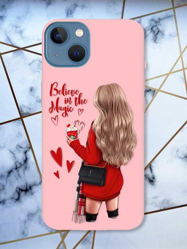 Матовый розовый чехол на iphone 13 :: девушка с кофе (принт 137)