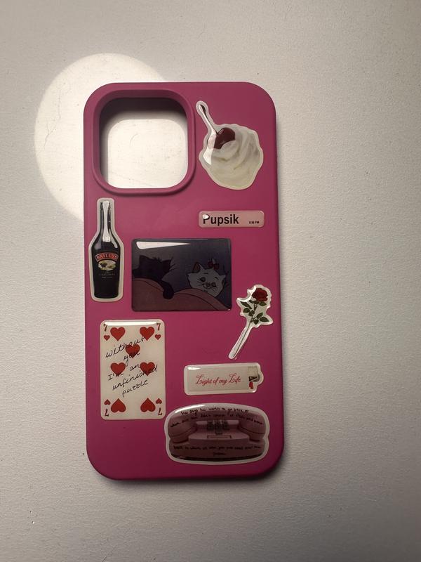 •Матеріал — якісний силікон, мʼякий та приємний на дотик. •Тип - накладка, щільно прилягає до телефону та захищає від подряпин і легких ударів. •Дизайн — яскравий рожевий із креативними наліпками у стилі love & aesthetic: кіт, троянда, карта з написом, напої та романтичні цитати.🐈🌹🥀❤️🍾🍒