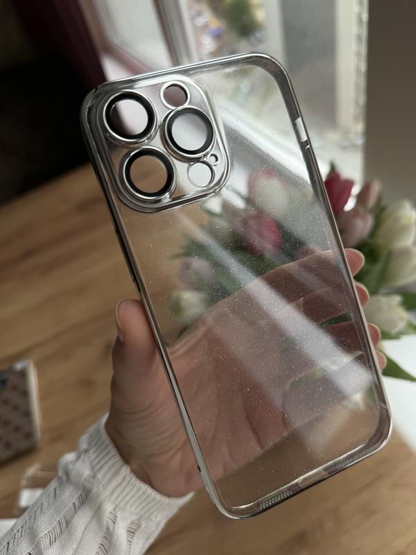 Чохол прозорий з сріблястим обідком , захистом камери та блискітками. Для iPhone 14 Pro Max