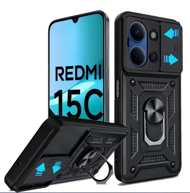 🛡️ Ударопрочный чехол для Xiaomi Redmi 15C со шторкой для камеры и кольцом Максимальная защита и функциональность для Вашего смартфона! Этот тактический чехол разработан для обеспечения высочайшего уровня защиты Вашего Xiaomi Redmi 15C , сохраняя при этом его удобство и добавляя полезные функции. 🔥 Ключевые преимущества и особенности: 1. Надежная защита 360° (Armor Case): - Двухкомпонентная конструкция: Чехол изготовлен из комбинации жесткого поликарбоната (PC) и упругогого термополиуретана (TPU), что гарантирует отличную амортизацию ударов и устойчивость к падениям. - Усиленные углы: Специальные утолщения по углам обеспечивают дополнительную защиту наиболее уязвимых частей корпуса. 2. Защитная шторка для камеры (Sliding Camera Cover): - Встроенная сдвижная крышка-шторка позволяет мгновенно закрыть блок камер, надежно защищая объективы от царапин, пыли и грязи. 3. Многофункциональное металлическое кольцо-держатель: - Комфортное удержание: Кольцо вращается на 360°, обеспечивая надежный хват и предотвращая случайное выскальзывание телефона из руки. - Функция подставки: Кольцо легко трансформируется в удобную настольную подставку для просмотра видео, совершения видеозвонков или чтения без помощи рук. - Совместимость с автодержателем: Металлическая пластина по центру кольца позволяет легко закреплять телефон на магнитных автомобильных держателях (без дополнительных наклеек). 4. Дизайн и совместимость: - Цвет: Стильное и агрессивное сочетание черного корпуса з красными акцентами. - Точное соответствие: Чехол имеет все необходимые вырезы для портов и динамиков, а также точные накладки на кнопки для легкого нажатия. - Совместимость: Предназначен для модели Xiaomi Redmi 15C. > Выберите максимальную защиту и забудьте о заботах по безопасности Вашего > смартфона!