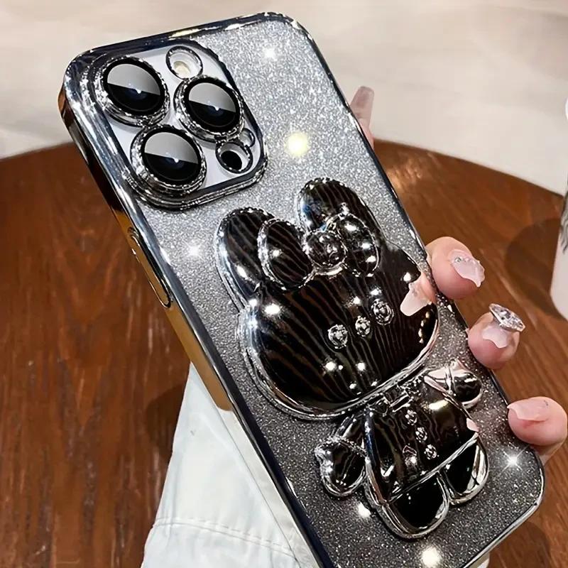 Роскошный чехол с гальваническим покрытием для телефонов Apple iPhone 15 Pro Max. Стильный держатель для телефона с милым зайчиком и скрытым держателем. Ультратонкая защита от повреждений при падении.