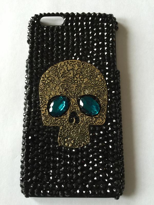 Чехол на iPhone 6Plus,отличное качество, глаза черепа сделаны из больших темно-берюзовых камней, весь чехол в черных стразах. Сделан из пластика.В упаковке.