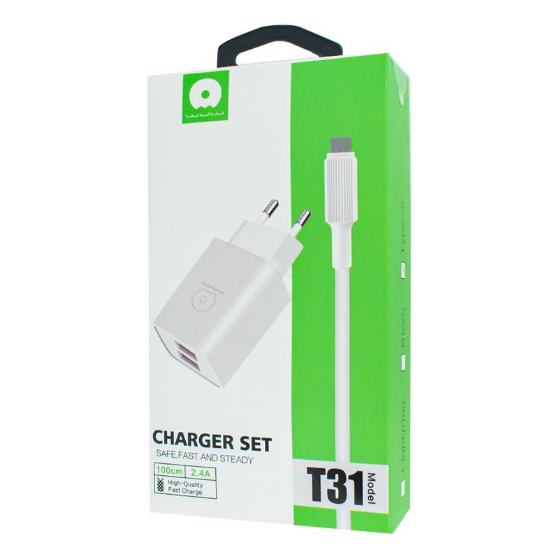 Wuw 2 usb charger+data 2,4a cable t31 microusb white