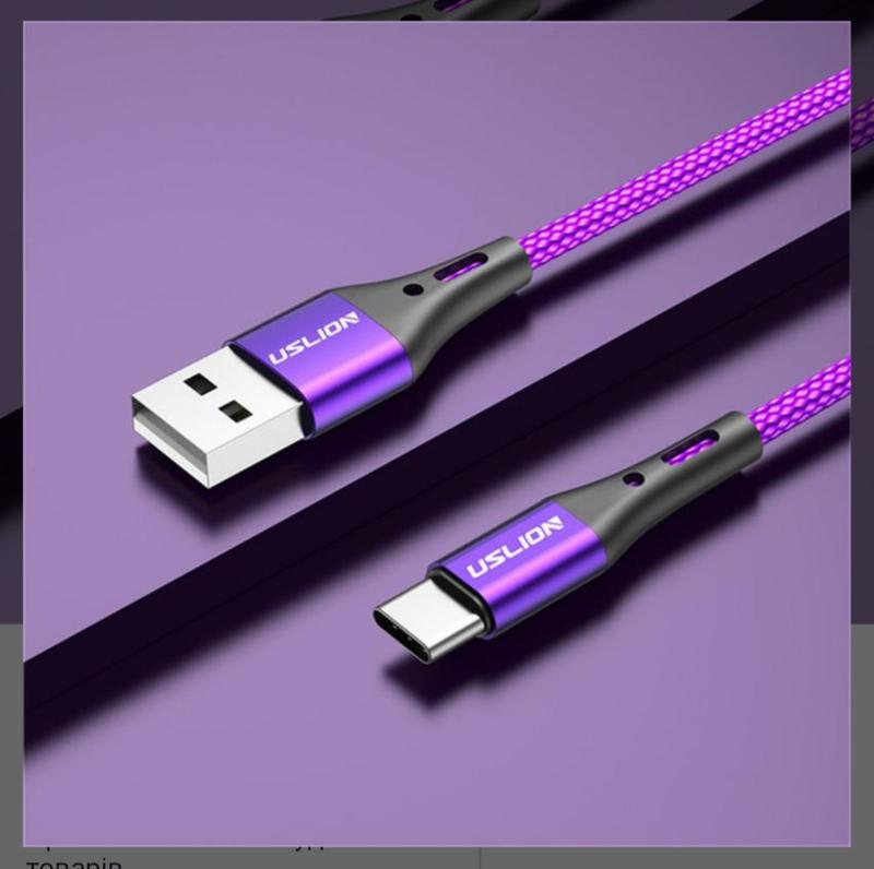 Зарядный кабель USLION USB to Type-C 3A, 1 м. Зарядный кабель подходит для передачи данных и быстрой зарядки смартфонов, планшетов и других мобильных устройств. - Соединение: USB - Type-C; - Выходной ток: 3 A - Поддерживает быструю зарядку - Передача даних; - Кабель с нейлоновой оплеткой и качественной оболочкой из алюминиевого сплава - Длина: 1 метр - Цвет: Фиолетовый