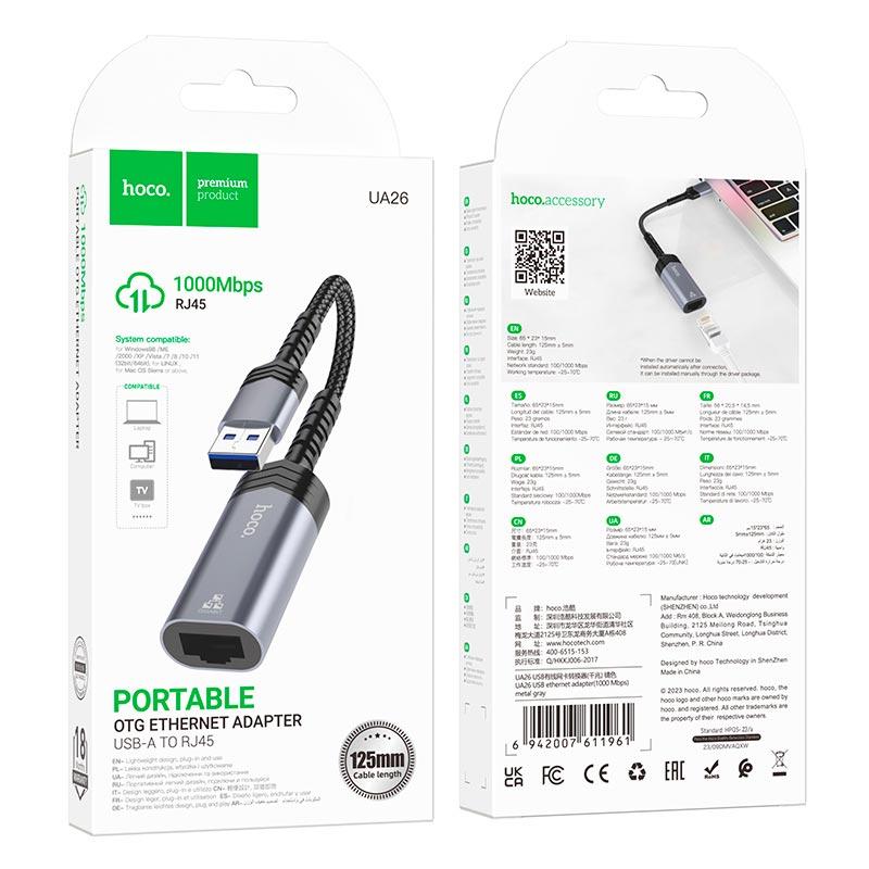 Переходник Hoco UA26 USB to Ethernet adapter (1000 Mbps) поможет дополнить совместимые устройства интерфейсом Ethernet для их проводного подключения к сети интернет. Соединение между устройствами осуществляется через USB – RJ45. Длина кабеля 125 мм. Универсальный переходник UA26 отличается надежностью и стабильно высокой скоростью передачи данных по сетевому стандарту 1000Mbps. Благодаря небольшому весу и компактным размерам его всегда можно носить с собой, например, в сумке с ноутбуком. Корпусные детали переходника качественно собраны, изготовлены из прочного, приятного на ощупь ABS пластика и алюминиевого сплава. Медный сердечник кабеля защищен эластичной, стойкой к растяжениям и разрывам внешней оплеткой. Hoco UA26 станет отличным выбором для использования с современными ноутбуками, которые лишены стандартного разъема RJ45, а также надежной заменой вышедшей из строя сетевой карты настольного ПК. Поддержка технологии Plug&Play значительно упростит процесс подключения к сети, избавив от необходимости установки специализированного программного обеспечения на компьютер. Кроме того, адаптер может подключаться к некоторым моделям смартфонов и планшетов через соответствующий OTG переходник, что предоставит возможность, например, играть в онлайн игры, требующие стабильного высокоскоростного интернет соединения.