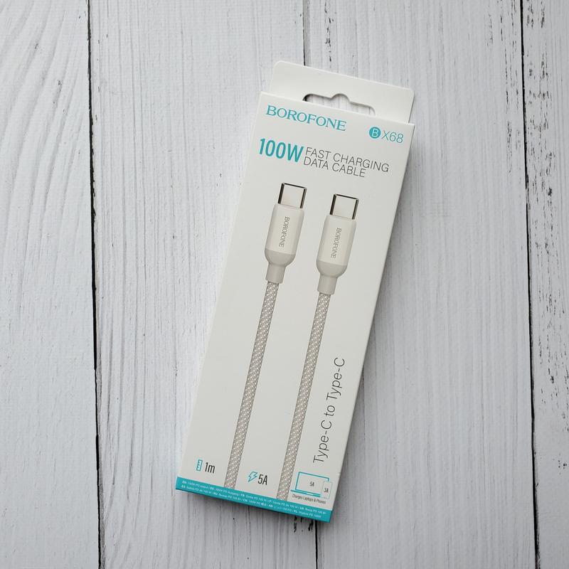 Кабель Borofone BX68 Type-C to Type-C 100W: - Подходит для зарядки смартфонов, планшетов и ноутбуков; - Установка соединения между устройствами осуществляется через Type-C к Type-C; - Чистый медный сердечник; - Наружная оплетка кабеля изготовлена из нейлона; - Поддержка передачи данных и быстрой зарядки с максимальной мощностью 100Вт и током до 5А; - Длина кабеля - 1 метр.