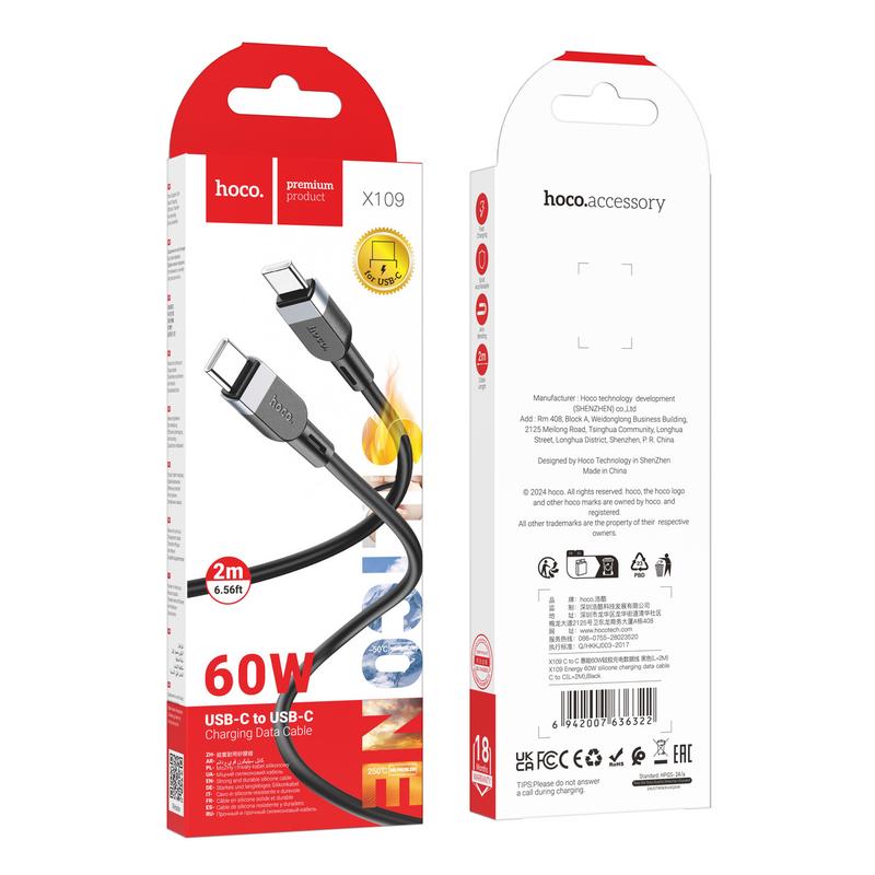 Кабель hoco x109 silicone type-c to type-c 60w 2m колір чорний