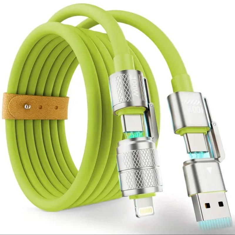 Кабель для зарядки и передачи данных 4 в 1 — универсальное решение для владельцев нескольких устройств. Поддерживает Apple CarPlay и Android Auto, обеспечивая стабильное соединение в автомобиле и дома. Изготовлен из прочного прорезиненного материала, который не ломается и выдерживает повышенные нагрузки, гарантируя долговечность. Скорость передачи данных — до 480 Мбит/сек, что позволяет быстро синхронизировать файлы, а поддержка быстрой зарядки мощностью 100 Вт обеспечивает молниеносное восполнение энергии. Оснащён четырьмя портами — USB-A, Lightning, USB-C — для одновременной зарядки и работы с разными гаджетами. Идеален для ежедневного использования — как дома, так и в дороге.