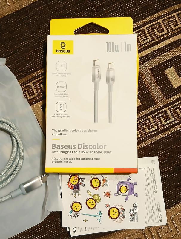 Кабель Baseus Discolor Series Fast Charging Data Cable Type-C to Type-C 100W 20V 5A 1m Поддерживает зарядку мощностью 100 Вт и обеспечивает скорость передачи данных до 480 Мбит/с 100 Вт (W): Этого достаточно для быстрой зарядки не только смартфонов, но и мощных ноутбуков (например, MacBook Pro). 480 Мбит/с: Это стандарт скорости USB 2.0. Он отлично подходит для синхронизации файлов, но для передачи больших видеоархивов существуют более быстрые стандарты (USB 3.0 и выше). Во время зарядки вы можете пользоваться телефоном и не беспокоиться о перегреве разъемов, что может повредить батарею устройства. Отделка кабеля: -Кабель Baseus USB Type-C to USB Type-C оснащен гладкими и прочными штекерами, устойчивыми к истиранию и окислению. Даже после многократного использования они будут так же плавно и надежно подключаться к портам. -Силиконовый материал обеспечивает защиту, гибкость и долговечность. Такая конструкция повышает прочность, позволяя кабелю легко выдерживать ежедневное использование. Вы можете не переживать, что из-за случайного сильного растяжения кабель придется выбросить. Впечатляющее место каждого кабеля — соединение между проводом и штекером — дополнительно усиленно материалом TPE в шнуре Baseus Type-C to Type-C.