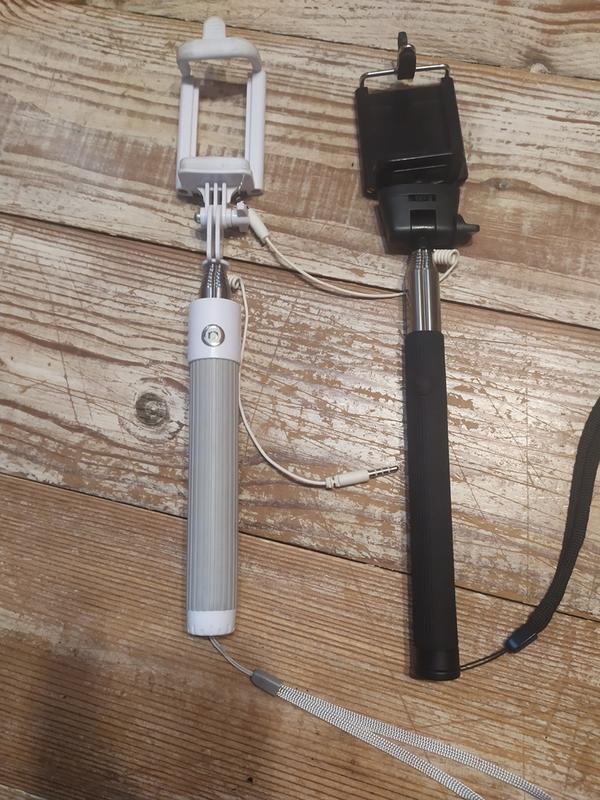 Селфи-палки разные, длина 65, 90, 105 см, проаодные - кнопка спуска затвора камеры на ручке и проводок для подключения смартфона сверху, работают как положено.