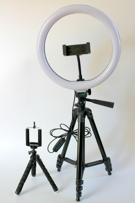 Хит набор 2 шатива и кольцевая лампа 26см led лед кольцо со штативом Штатив 100см Изготовлен из высококачественного алюминиевого сплава, складной и переносной. Регулируемая высота штатива от 32см до 100см Имеет индикатор уровня Штатив 23см Имеет гибкие нождки Высота 23см Два штатива в наборе дает возможность вести сьемку с двух ракурсов Светодиодную кольцевую лампу можно установить на один из двух штативов в комплекте. Кольцевая лампа обладает тремя режимами света: теплый свет, нейтральный и холодный. Вы можете легко выбрать необходимый для вас свет и настроить его яркость. LED кольцо, подключается к источнику питания через стандартный USB кабель, что дает возможность его подключать к power bank, компьютеру, ноутбуку и т. д. Вы сможете в любое время подключить и отключить кольцо. Легка конструкция, позволяет быстро его снять и закрепить обратно. Лампа широко применима в сферах: блогерства, моды, beauty индустрии. Можно использовать просто как светильник или дополнительное освещение в помещении. Технические характеристики светодиодного кольца: - Цветовая температура холодного света: 6500K - Цветовая температура теплого света: 3200К - Диапазон изменения освещенности: от 10% до 100% - Материал корпуса: пластик - Размер: диаметр 26 см. - Питание: от USB - Длина кабеля: 2 м Комплектация: - Светодиодное кольцо 26см - Крепление для телефона - Штатив 100см - Штатив 23см - Крепление для телефона