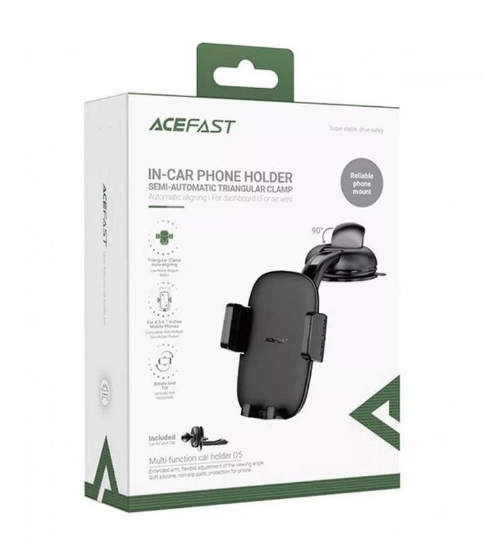 Acefast D5 -- универсальный автодержатель для смартфона. Основные характеристики: - изготовлен из пластика, металла и силикона; - крепится на приборную панель или дефлектор; - подходит для смартфонов размером 4,5-6,7 дюйма; - выделенная кнопка разблокировки устройства; - шарнирное крепление вращается на 360°; - силиконовые накладки на фиксаторах для смартфона защищают от царапин; - в комплекте 2 вида крепления. Универсальная установка Держатель можно установить как на приборную панель, так и на решетку воздуховода. Крепление для дефлектора зажимное с винтовой фиксацией, а подставка для приборной панели фиксируется благодаря присоске и дополнительной адгезивной накладке. Оба способа обеспечивают устойчивое положение держателя и не оставляют следов. Удобный обзор Установка безопасна для вождения, так как держатель со смартфоном не закрывает обзор дороги, не отвлекает водителя, сохраняет быстрый и простой доступ к устройству. Шарнирное крепление вращается на 360° -- вы свободно можете выбирать горизонтальное или вертикальное положение своего гаджета. Полуавтоматический зажим Держатель подходит для любых смартфонов размером 4,5-6,7 дюйма. Выделенная кнопка раскрывает фиксаторы при нажатии -- таким образом, гаджет легко снять одной рукой. Защитные свойства Силиконовые накладки на поверхности фиксаторов защищают корпус смартфона от появления царапин. Металл и прочный пластик устойчивы к механическому воздействию, коррозии и температурным перепадам, обеспечивая долгий срок службы.