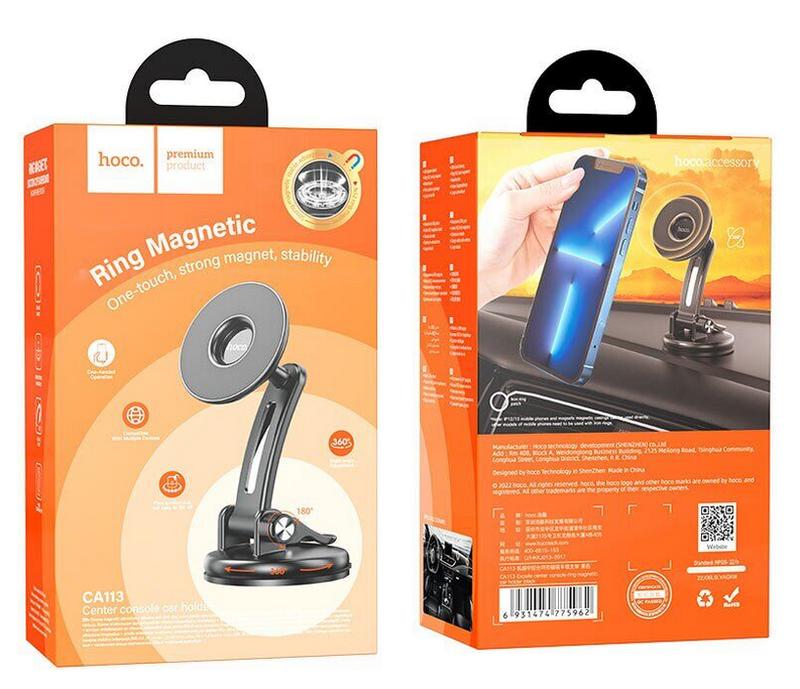 Автодержатель Hoco CA113 сделает использование смартфона в автомобиле максимально простым, комфортным и безопасным. Модель выполнена в современном, оригинальном дизайне и имеет компактные размеры, благодаря чему, крепясь мощной присоской на торпедо или лобовое стекло, она лаконично вписывается в салон, не отвлекает внимание, не мешает обзору дороги и управлению автомобиля. Конструкция аксессуара изготовлена из качественного ABS пластика, состоит из прочного основания с удобным фиксатором, активирующим вакуумную присоску, и слегка изогнутой ножки, которая соединена с ним цилиндрическим слоем, что позволяет фиксировать ее под определенным углом наклона. Ножка, в свою очередь, соединена шаровым шарниром с магнитной площадкой, выполненной в виде кольца, что позволит регулировать положение удерживаемого гаджета вокруг своей оси на все 360°. Магнитная фиксация гаджета осуществляется с помощью пластины, устанавливаемой на обороте крышки корпуса или под чехлом.