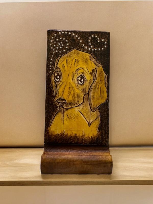 Оригинальная вещь, которая будет только у вас. Подставка ручной работы для смартфона или планшета. Техника исполнения: порография (выжигание по дереву). Дерево липа. Изделие покрыто акриловым лаком. Размер наклонной плоскости 7х10,5 см