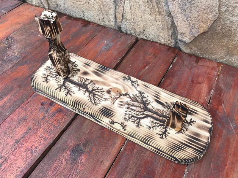 Ищете необычный держатель для топора? Вот он! Этот держатель для топора станет отличным подарком для мужчины, у которого уже есть топор, но еще нет держателя. Держатель немного обожжен и имеет выжженный рисунок в виде молний, что придает ему красивого сочетания цветов. Размер держателя для топора: 45 см x 20 см Размер можно подогнать под размер вашего топора. Материал: сосна.
