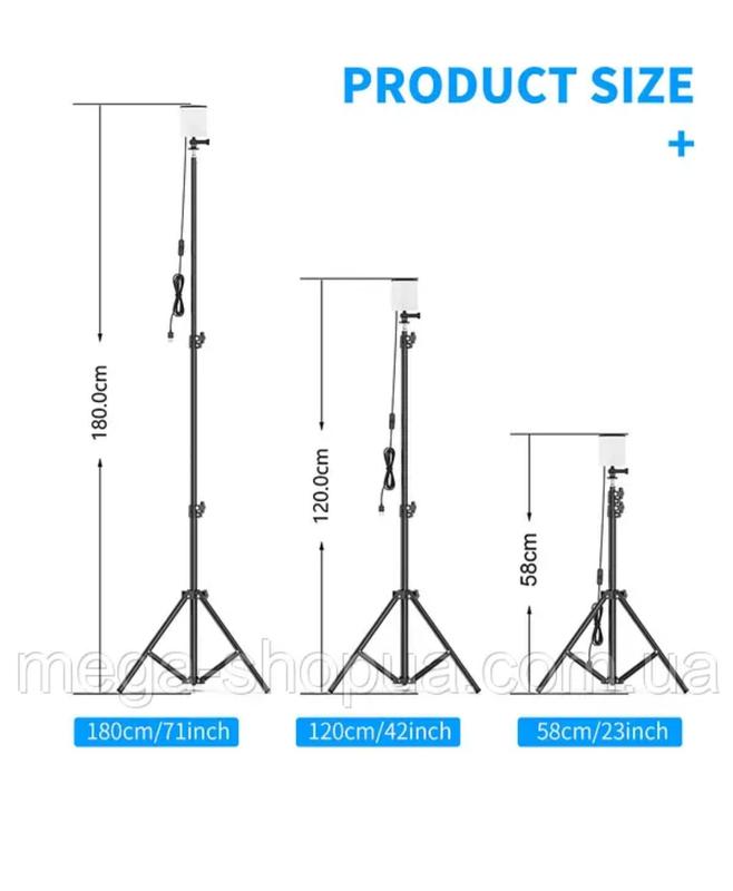 Штатив с регулируемой высотой От 58 -180 см Подходит под лампу Стандартные резьбовые соединения дают возможность крепить лампу к любым стандартным штативам, триподам, моноподам, стедикам, а до самой лампы крепить фото- и видеокамеры, зеркала и увеличительные стекла. Прочная и компактная конструкция