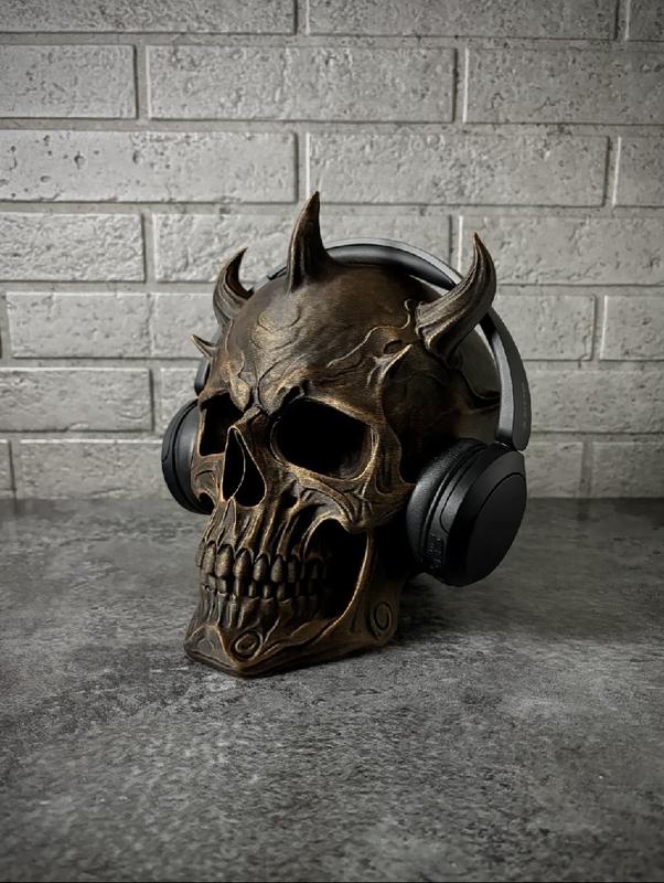Рогатий череп виконаний у готичному стилі. Чорний колір із золотою патиною. Він стане відмінним доповненням вашого робочого місця, доповнить колекцію або стане атрибутом вашого інтер'єру. Розмір оригінальний 1:1 зі справжнім. Виготовлений із міцного пластику, методом 3D друку.
