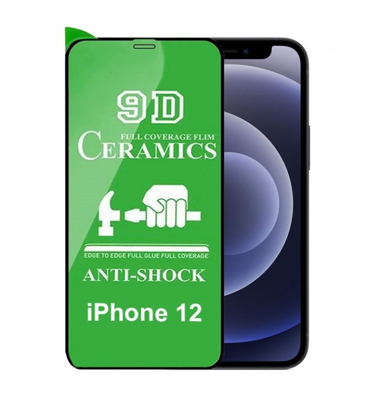 Протиударна керамічна захисна плівка для смартфона Apple iPhone 12. Протектор увібрав кращі якості захисних аксесуарів. Подібно плівці, гнучке скло для не розпадеться на осколки при ударі. Від загартованого скла покриття перейняло товщину, високу міцність і стійкість до подряпин. Встановлюється плівка на весь екран закриваючи рамку навколо дисплея. Аксесуар зливається з передньою панеллю і практично непомітний на смартфоні. На поверхню Ceramic Film нанесено олеофобне покриття. Тонкий шар відштовхує жири і краплі рідини, допомагає лицьовій панелі пристрою залишатися чистіше. Протектор приклеюється всією площею до поверхні екрану. Між плівкою Ceramics 9D і смартфоном не потрапляє повітря і пил, а сенсор швидко реагує на команди.