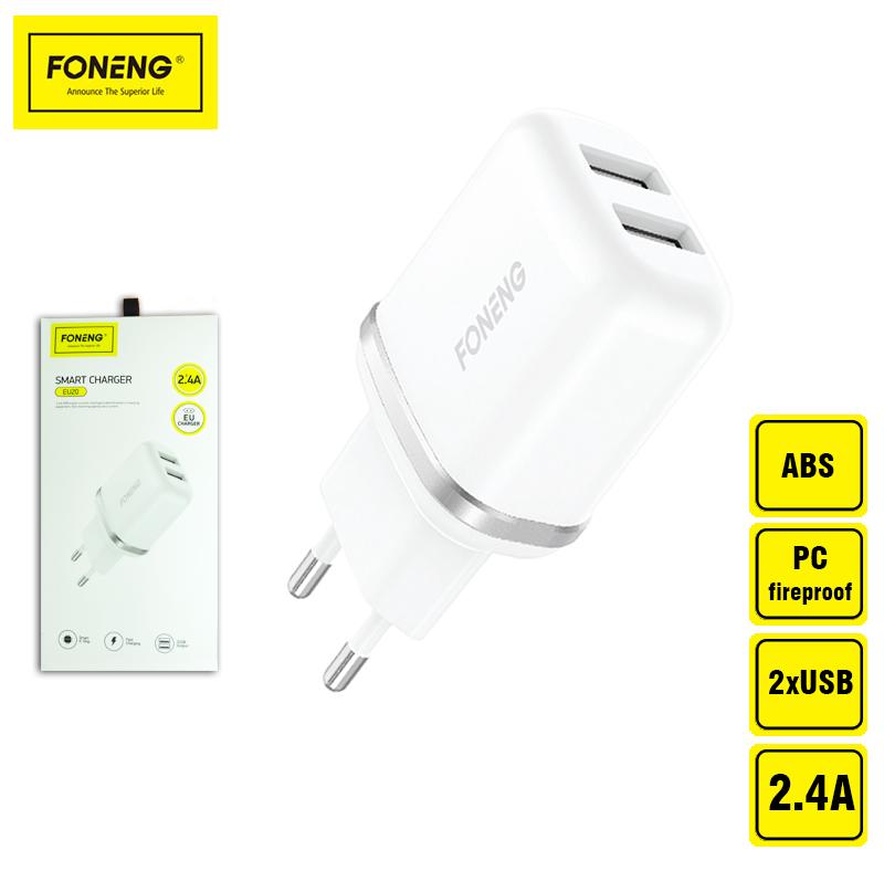 Одна из топовых моделей бренда FONENG, новейшее Зарядное устройство 2xUSB FONENG с функцией быстрой зарядки Fast Charge отличается оригинальным, современным и запоминающимся дизайном, приятными тактильными ощущениями. Устройство имеет 2 USB портf. Зарядное устройство изготовлено из качественного ABS пластика, и огнеупорных материалов, что делает устройство безопасным. Все эти факторы, в сочетании с высоким КПД, защитой от перепадов напряжения и от перегрузки, делают зарядку одним из самых лучших вариантов в своем сегменте зарядных устройств. Совместимость: Подходит для смартфонов и планшетов Количество USB-портов: 2 Быстрая зарядка: Fast Charge Входной ток: 110-240V~50/60Hz 0.5A(MAX) Выходной ток: DC5.**********A Выходной разъем: USB Цвет: Белый Страна-производитель товара: Китай Гарантия: 12 месяцев