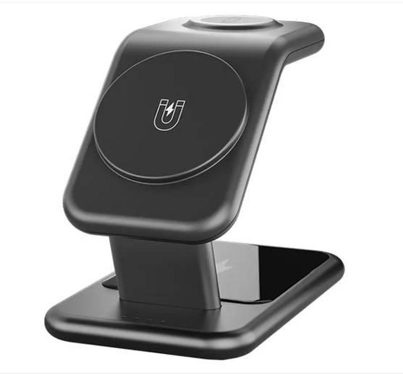 Данная модель может использоваться для беспроводной зарядки iPhone 12 и новее, зарядных кейсов AirPods начиная со 2-го поколения, Apple Watch 1-7 поколений, а также других совместимых гаджетов и Android смартфонов. Благодаря стильному дизайну и компактным размерам оно лаконично впишется в любой интерьер, устанавливаясь на рабочем столе, журнальном столике или прикроватной тумбочке. Корпус аксессуара реализован в удобной, практичной форме со скругленными ребрами и устойчивым основанием. Его надежно собранные детали изготовлены из прочной комбинации металла, поликарбоната и ABS пластика. Верхняя горизонтальная площадка предназначена для зарядки смарт часов с исходящей мощностью 2W и частотой 110-205KHz на расстоянии 0-8мм. Эффективность преобразования энергии на ее выходе составляет 75%. Расположенная под углом панель предназначена для зарядки смартфонов и поддерживает технологию MagSafe. Исходящая мощность на ее выходе может составлять 5, 7.5, 10 и 15W. На верхней панели основания находится площадка для зарядки кейса наушников с мощностью 3W и LED индикаторы, которые помогут контролировать состояние устройства. Общая мощность на его выходе регулируется автоматически в соответствии с заряжаемыми гаджетами и ограничена 15W. К источнику питания с исходящей мощностью 18W устройство подключается с помощью встроенного разъема Type-C и комплектного кабеля. Входящее напряжение составляет 9V при силе тока 2A и 12V при силе тока 2A.