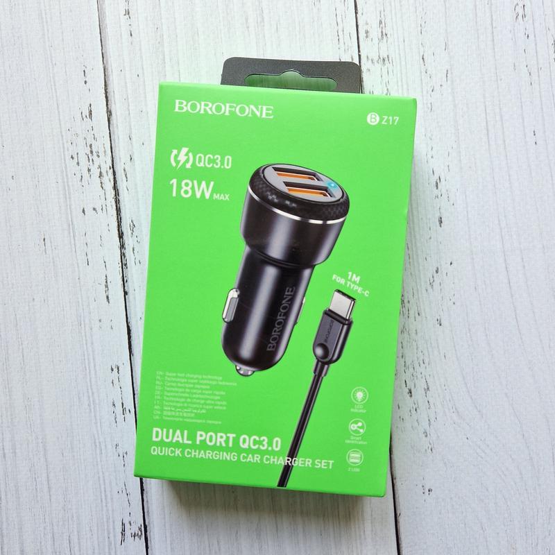 Зарядное устройство borofone bz17 2usb 18w qc3.0 с кабелем type-c (1м) в авто