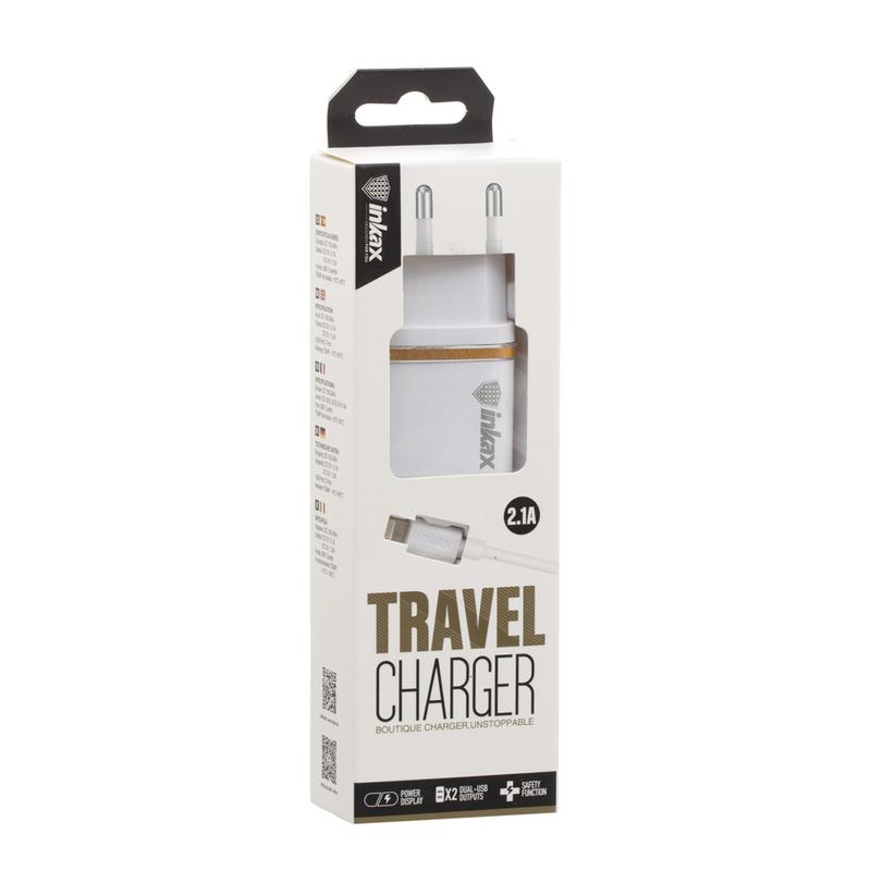 Сетевое зарядное устройство INKAX CD-11 Lightning Поможет восполнить заряд за минимальное время. Адаптер идентифицирует заряжаемое устройство и автоматически регулирует выходную мощность до 2,1 А. Исполнение зарядного устройства с золотыми вставками оригинально впишется в дизайн интерьера дома. На адаптере расположены два USB входа для одновременной зарядки двух устройств. В комплект к зарядному устройству входит USB кабель Lightning