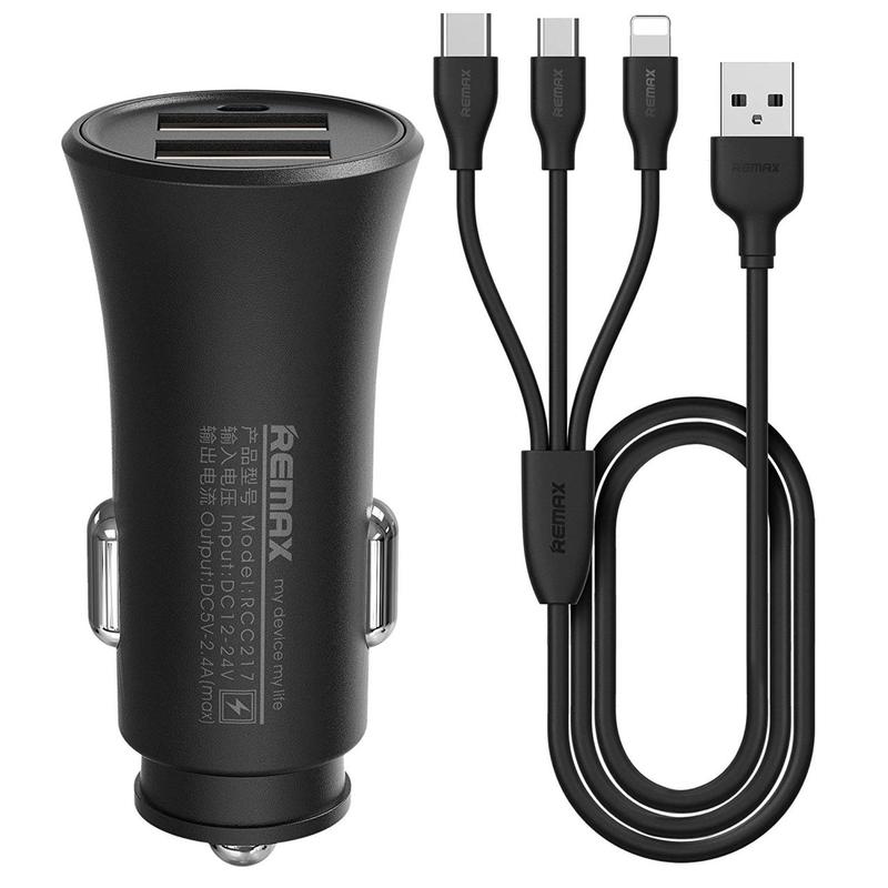 Зарядное устройство от прикуривателя remax rcc-217 rocket 5v/2.4a 2usb-a lightning/usb-c/m...