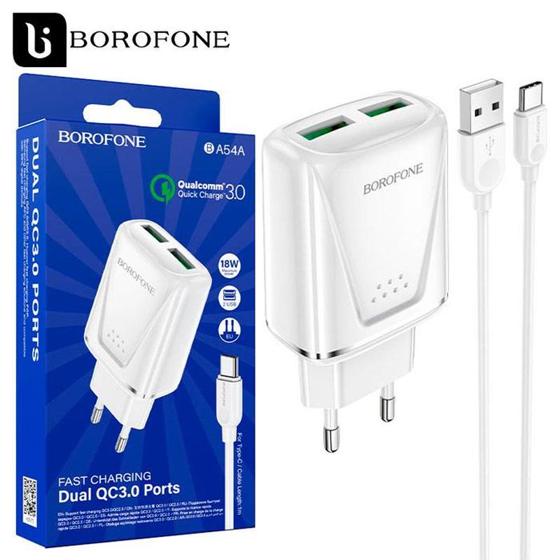 Сетевое зарядное устройство Borofone BA54A QC3.0 18W 2USB 3.0A Type-C white