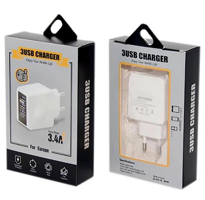 Адаптер 220V 3USB - надежное устройство для зарядки телефонов и планшетов. Поможет восполнить заряд смартфона за минимальное время. Выходящая мощность имеет стабильный показатель, что делает процесс зарядки безопасным. Корпус устройства выполнен из прочного пластика и имеет достаточно компактные размеры. Характеристики: - Тип: Сетевые - Количество USB разъемов: 3 - Наличие кабеля: нет - Покрытие корпуса " Soft-touch" - Входное напряжение: 100 - 240 В - Выходное напряжение: 5 В макс 3.1A -