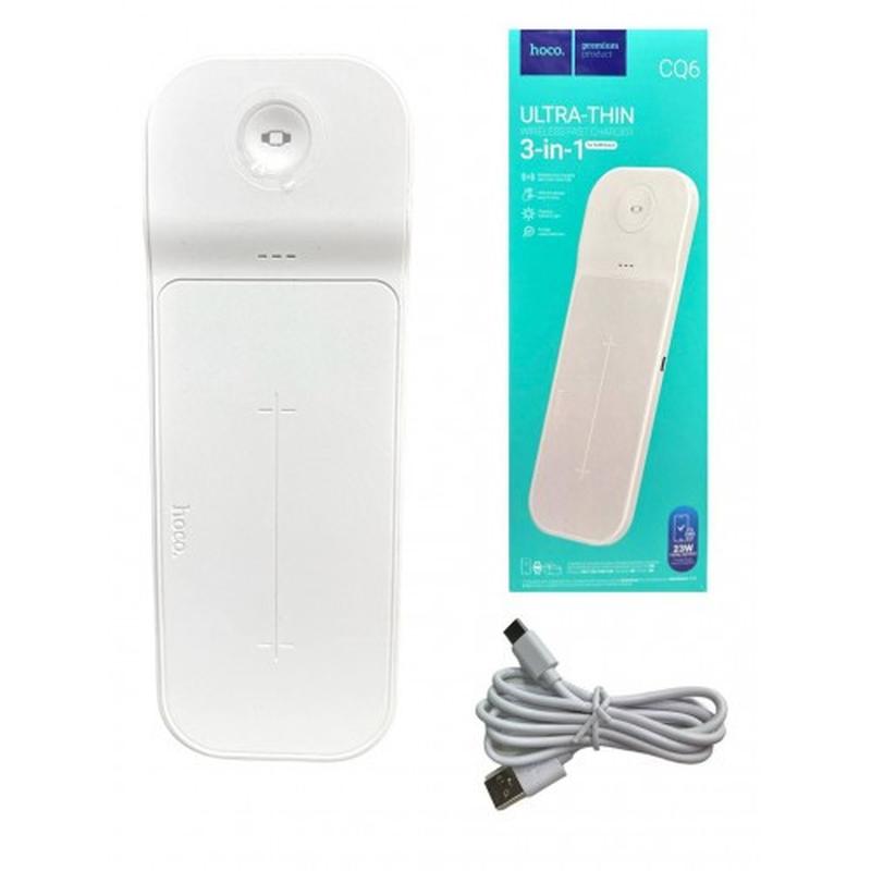 Бездротова док-станція HOCO, 3в1. Сумісна з різними моделями телефонів, навушників та годинників від відомих виробників. Матеріал - пластик. Вхід - Type-C: 5 В/3 А, 9 В/2 А. Вихідна потужність - мобільного телефону 5 Вт/7,5 Вт/10 Вт/15 Вт, навушників 5 Вт, годинника 3 Вт. Упаковка – коробка.