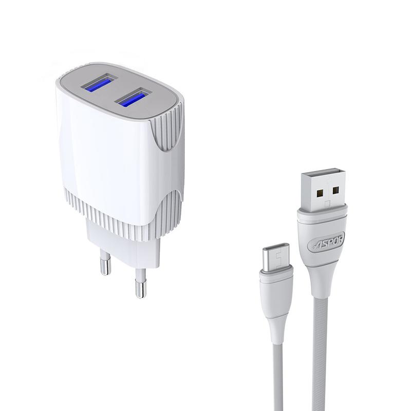 Сетевое зарядное устройство aspor a811 (2usb/2.4a) + usb кабель type-c- белый