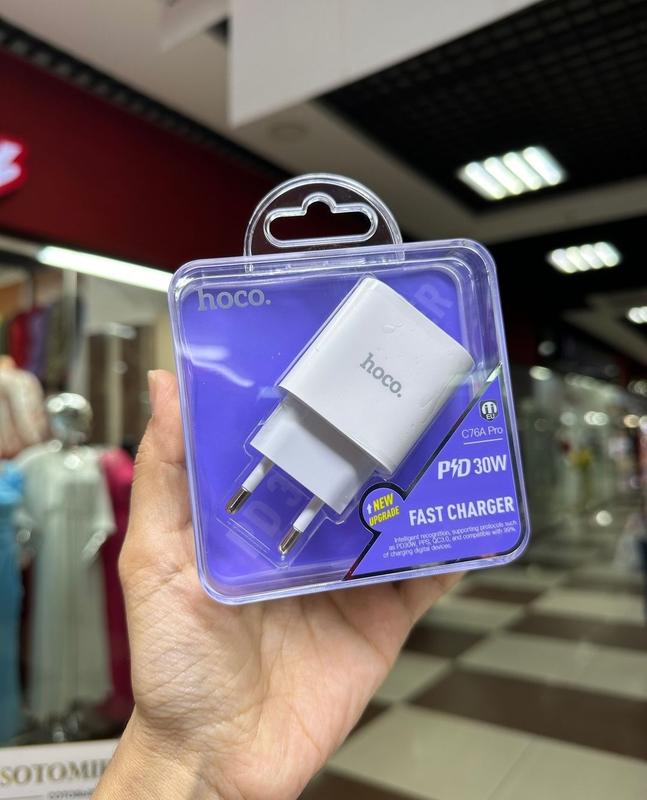 Сетевое зарядное устройство Hoco C76A Pro – это высокотехнологичный, универсальный адаптер, который совместим с 99% современных портативных гаджетов. Аксессуар поставляется в оригинальной упаковке, реализован в практичном, классическом дизайне со скругленными боковыми ребрами и приятной на ощупь поверхностью. Благодаря компактным размерам, его можно использовать дома, брать с собой на работу в офис или в поездки за границу. Корпус устройства качественно собран, изготовлен из прочной, огнестойкой комбинации ABS пластика и поликарбоната. На его нижнем торце находится сетевая никелированная вилка стандарта EU для подключения к совместимым розеткам с напряжением 100-240V на выходе. Верхняя панель устройства выполнена со слегка изогнутыми краями, что подчеркивает его привлекательный внешний вид. В ее центре находится современный разъем Type-C. Максимальная мощность на его выходе составляет 30W (5V/3A, 9V/3A, 12V/2.5A, 15V/2A). Модель оснащена многоуровневой системой защиты и функцией интеллектуального определения мощности, которая необходима для быстрой, максимально безопасной и стабильной зарядки гаджета. Высокая скорость процесса зарядки совместимых устройств обеспечивается поддержкой протоколов PD, QC3.0 и технологии PPS с напряжением 3.3-11V при силе тока 2.75A.