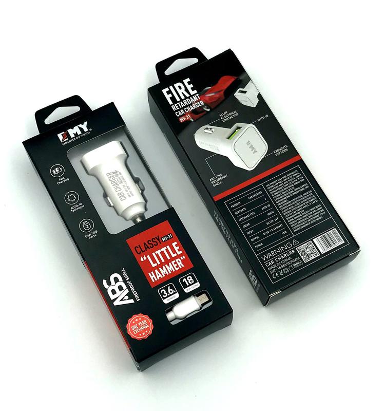 Автомобильное зарядное устройство EMY MY-31 с 2 USB портами является универсальным решением для подзарядки смартфонов, планшетов, фотоаппаратов и других устройств. Данное универсальное зарядное устройство может стать вашей дополнительной зарядкой в путешествии, чтобы не брать всюду оригинальное зарядное вашего устройства. Автомобильное зарядное устройство EMY - это надежный аксессуар для всех портативных устройств. Преимущество данного зарядного устройства: - Система зарядки устройств AUTO-ID (Зарядка сама определяет какой ток нужно дать устройству для зарядки, не вредя при этом аккумулятору); - Быстрая зарядка устройств; - 2 USB порта, что позволит заряжать одновременно 2 устройства; - Защита от перегрузки по напряжению; - Корпус зарядки выполнен из огнеупорного пластика; - Компактный размер; - В комплекте идет кабель Micro USB.