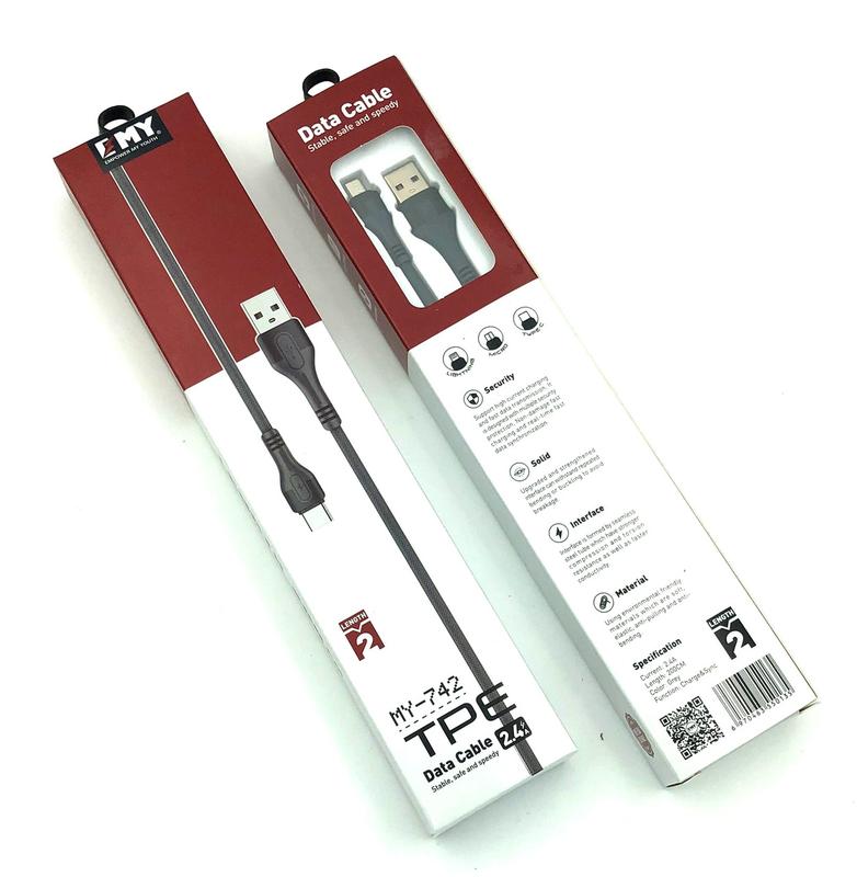Дата кабель EMY MY-742 для быстрой и эффективной зарядки вашего гаджета и передачи данных. Поддержка сильноточной зарядки и быстрой передачи данных. Он разработан с множественной защитой. Быстрая зарядка без повреждений и быстрая синхронизация данных в реальном времени. - Ток 2.4А обеспечивает сверхбыструю зарядку и передачу данных. - Материал: использование экологически чистых материалов, мягких, эластичных, устойчивых к растяжению и изгибу. - Длина: 2 м