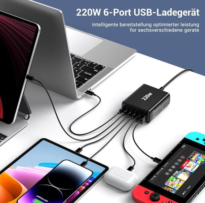 Это высокопроизводительное зарядное устройство — идеальное решение для организации рабочего пространства. Благодаря суммарной мощности 220 Вт и наличию 6 портов USB, вы можете одновременно заряжать до шести энергоемких устройств: от ноутбука (MacBook) и игровых консолей (Nintendo Switch) до планшетов, смартфонов и наушников. Основные преимущества: Технология GaN: Компактный размер при экстремально высокой мощности без перегрева. Интеллектуальное распределение: Умный чип автоматически подбирает оптимальный ток для каждого подключенного гаджета. Универсальность: Поддержка всех современных протоколов быстрой зарядки. Безопасность: Многоуровневая защита от перегрузки, короткого замыкания и перенапряжения. Отзывы Алексей: "Наконец-то избавился от кучи блоков в розетке. Спокойно тянет мощный рабочий ноут и телефон одновременно. Не греется, сделано качественно." Марина: "Очень удобная штука для стола. Заряжаю сразу айпад, телефон и часы. Выглядит стильно и экономит кучу места." Игорь: "Реально выдает заявленную мощность. Для поездок — незаменимая вещь, один блок на всю технику семьи."