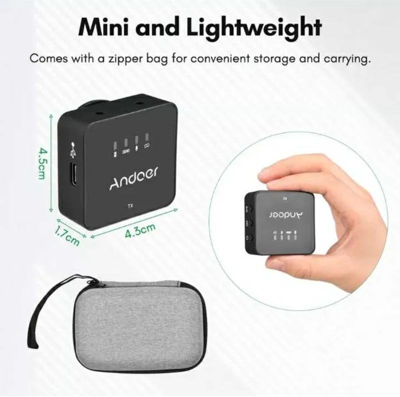 Andoer 1-Trigger-2 2,4G Беспроводная микрофонная система 2 передатчик + приемник клип на микрофон 3,5 мм TRS & TRRS для камеры смартфона описание предмета Особенности: Беспроводная микрофонная система 2,4GДва передатчик вызваны один ресивер декодер каналов кабельного телевидения, принимает 2,4G глобальная перевозка частоты и эффективная дальность передачи до возможностью погружения на глубину до 30 м. (Звуковой Монитор в реальном времени 1 Приёмник имеет 3,5 мм наушники интерфейс, поддерживает аудио в режиме реального времени осуществлять контроль, чтобы быть уверенным, запись с высоким качеством звука и держите микрофон работает надлежащим образом. [Широкое применение ] Включает в себя 3,5 мм TRS и Гррп Аудио кабель, совместимый со смартфоном/ камеры/видеокамеры, подходит для видеоблог, прямые трансляции, интервью, видео запись и т. д. [ Встроенный перезаряжаемый аккумулятор 1 Передатчик и приемник имеют встроенную перезаряжаемую батарею, которую можно заряжать через предоставленные usb-кабели, долгое время работы и удобную подзарядку. (Легкий и портативный Легкий и компактный дизайн, поставляется с чехлом для хранения на молнии, может быть помещен в рюкзак, очень удобно носить с собой. Функции: Цвет: черный Эффективный диапазон: Макс. 30 м Отношение сигнал-шум: >75 дБ Чувствительность: 90 дБ Батарея Ёмкость: 3,7 V 400 мАч (передатчик), 3,7 V 350 мАч (приемник) Товар Размеры: 4,5*4,3*1,7 см/1,8*1,7* 0.7in Товар Вес: 25g/0,9 oz упаковочный лист: 2* передатчики 1 * приемник 1*3,5 мм TRS для кабеля NYM 1*3,5 мм кабель TRS-TRRS 2* USB кабели для зарядки 1* чехол для переноски