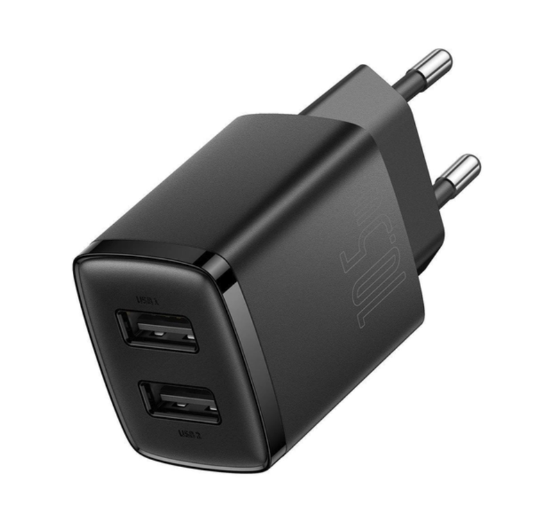 Сетевой адаптер Baseus Compact Charger 10.5W – компактный, элегантный, инновационный и стильный девайс с двумя USB портами, которые помогут Вам одновременно заряжать 2 устройства благодаря выходной мощности 2.1A. Данное зарядное устройство – отличное решение для тех, кто часто передвигается с места на место. Компактные размеры позволят значительно сэкономить место в сумке или на рюкзаке. Два выходных порта обеспечат безопасный и эффективный заряд одновременно двум устройствам. Корпус изготовлен из прочного пластика, устойчивого к различным повреждениям и ушибам. Автоматически определяет устройство оптимизации параметров зарядки. Для безопасности Ваших гаджетов устройство встроено 6 уровней интеллектуальной защиты: от перегрузки по силе тока, перезаряда, перегрева, перегрузки, различных перенапряжений, коротких замыканий. Характеристики: Цвет черный Материал: ABS-пластик Сертификация качества: CE, RoHS, FCC, КНР Количество портов: 2 Вход: AC 100-240 В, 50/60 Гц Быстрая зарядка: Fast Charge Выход USB1: 5V/2A Max Выход USB2: 5V/2A Max Выход USB1 + USB2: 5V/2.1A Max Мощность: 10.5W Размеры зарядки: 78х36х28 мм Вес: 49 грамм