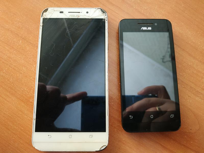 Продам два смартфони. Малый черный висит на заставке. нет АКБ. Белый взбитый, дисплей был целый, тачбитый но работал. АКБ нет - вздесь. Asus Z010DA белый Asus Zenfone 4 t00l