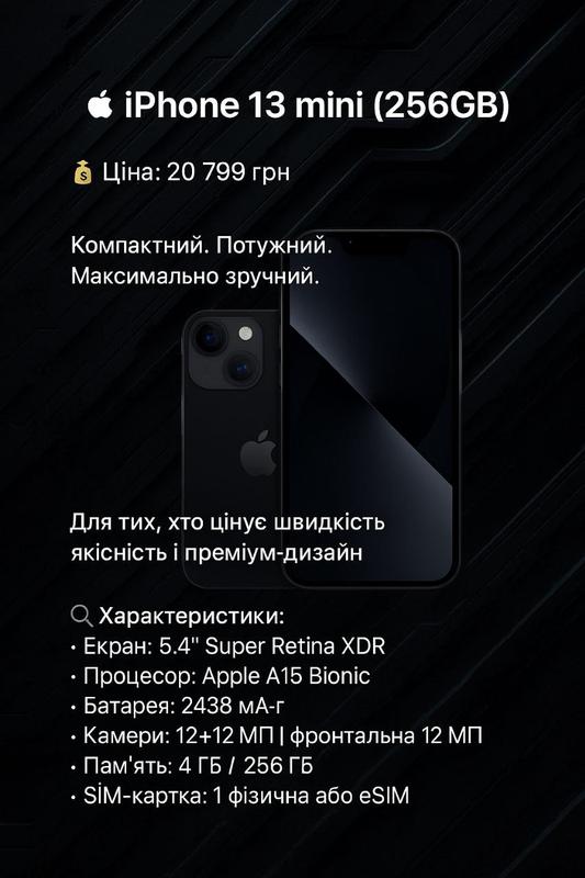 📱 • iPhone 13 mini (256Gb) 💸 Цена: 20 799 грн Компактный. Мощный. Максимально удобный. Этот 13 mini - настоящий гигант в маленьком корпусе. Для тех, кто ценит скорость, качество и премиум дизайн — без лишнего объема 🔥 🔍 Характеристики: Екран: 5.4" Super Retina XDR Процессор: Apple A15 Bionic Батарея: 2438 мАч Камеры: 12+12 Мп | фронтальная 12 Мп Пам’ять: 4 ГБ / 256 ГБ SIM-карта: 1 физическая или eSIM