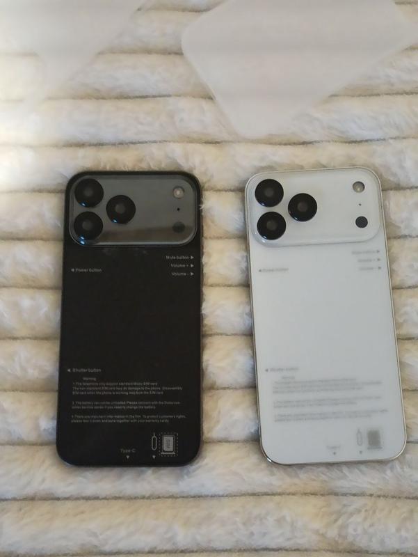 Китайская версия iPhone 17 о макс. Цвет черный и белый (как на фото). Смартфоны новые, с каждой стороны наклеена защитная пленка. Телефон полностью по размерам совпадает с 17 промахами но не имеет логотипа (можно купить чехол с логотипом). Зарядка через кабель type-c. Операционная система андроид с оболочкой ИОС. С учетом цены, должно быть понимание, что параметры смартфона как и камера сильно отличаются от айфона. В комплекте: зарядный кабель (type-c), блок питания, чехол (белый полупрозрачный), защитное стекло.