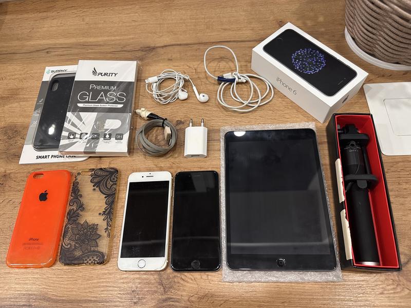 Продається все тільки одним лотом. 1. iPad mini 1-е покоління, сірий, працює 2. Зарядка з блочком до iPad mini, працює тільки блочок 3. зарядний кабель для iPhone 6/ipad mini, бу, працює але відходить інколи 4. iPhone 6, сірий: працює 5. iPhone 6, золотий: працює, нюанси: скол на екрані та неробоча кнопка Home (можна через assistive touch користуватися, для цього треба підʼєднати тел до пк, і при запуску пропустити етап де просить натиснути home кнопку, потім після початкових налаштувань тел можна встановити assistive touch іконку через налаштування тел) 6. навушники дротові для iPhone 6, працюють (мікрофон не перевіряли) 7. 2 бу чехла на iPhone 6 8. силіконовий чорний чехол на iPhone X/XS, новий 9. захисне скло нове на iPhone X/XS 10. селфі палка від huawei, робоча Зверніть увагу, що старі apple моделі вже не підтримують деякі програми та не оновлюються. Або по повній передоплаті або накладеним платежем без огляду на пошті (аби уникнути можливих крадіжок при огляді).