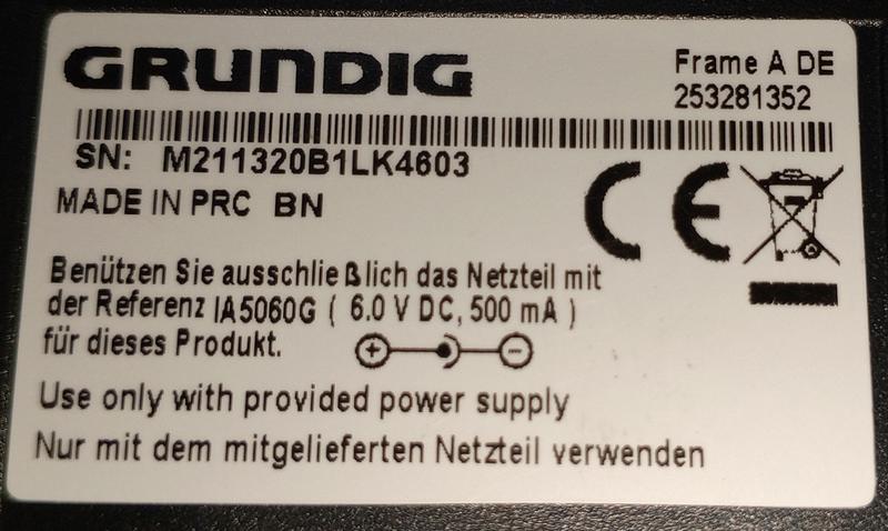 Блок питания рабочий проверен тестором. База не проверялась - световая индикация показывает. Блок питания 6.0 V DC, 500 mA Маркировка на базе: GRUNDIG SN: M211320B1LK4603 MADE IN PRC BN Benützen Sie ausschließlich das Netzteil mit der Referenz IA 5060G (6.0 V DC, 500 mA) für dieses Produkt. Frame A DE 253281352 CEX Use only with provided power supply Nur mit dem mitgelieferten Netzteil verwenden GRUNDIG IA 5060G Блок питания Model:1A50606 AC/DC ADAPTOR Modell/Model:1A50606 E Eingang/Input: 100-240V-50-60Hz 0.2A Ausgang/Output: 6V-500mA EFFICIENCY LEVEL: V OCO
