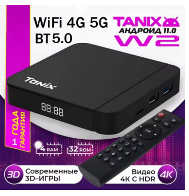 Характеристики: Модель: Tanix W2 ОС: Android 11 Процессор: Amlogic S905W2 1.8 GHz, Quad Core Видео ускоритель: Mali-G31 MP2 Dvalin Оперативная память: 2 Гб Встроенная память: 16 Гб Поддержка карт памяти: до 128 Гб WIFI: 2.4G + 5G Bluetooth: 4.2 Поддержка: Google Cast, Miracast Media поддержка: Декодер: H.263,H.264,H.265,VP9, AV1, HD MPEG4 Формат видео: AVI,DAT,ISO,MKV,MOV,MP4,MPEG,MPG,RM,WMV Аудио форматы: AAC,FLAC,MP3,OGG,RM,WMA Формат фото: BMP,GIF,HD JPEG,PNG,TIFF Интерфейсы: HDMI, microSD card slot, LAN, USB 2.0, USB3.0, AV Out, Optical, DC Power.