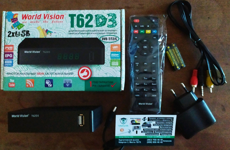 Виробник: World Vision Тип обладнання: Ресивери Торг Кілька примірників у наявності Перед продажей тестируется, обновляется, настраивается и добавляем бесплатные самообновляемые листы iptv каналов. Скидки от 2ух единиц. Отличительные особенности World Vision Т62 D3: изготовлен в пластиковом корпусе; процессор GX3235, ОЗУ 64 МБ, память флеш 4 МБ; поддержка стандартов DVB-T \T2\С ; имеет внешний блок питания 5V\ 1,2А; аппаратная поддержка звука АС3 Dolby Digital; поддержка Wi-Fi адаптеров ( RT5370 , MT7601); высокая чувствительность в приеме сигнала; наличие дисплея на лицевой панели. Передняя панель оформлена цифровым дисплеем и одним разъемом USB 2.0. На задней панели расположены разъемы HDMI и RCA (возможность подключить данный аппарат к любому типу телевизоров), антенный вход и второй разъем USB 2.0. Т2 приставка World Vision Т62 D3 довольно шустро работает, не виснет, оперативно реагирует на команды с пульта ДУ и выдает изумительное изображение на экран ТВ. При подключении к World Vision Т62 D3 Wi-Fi адаптера (естественно при наличии у Вас раздающего Интернет устройства) станут доступны приложения YouTube, IPTV (при наличии плей листов), Megogo, Погода, RSS Чтение. В іншому функціонал тюнер Т2 World Vision Т62 D3 стандартний: запис PVR, телетекст, таймер, програмний гід на 7 днів, TimeShift. Приймач забезпечує прийом 32 національних цифрових Т2 каналів.