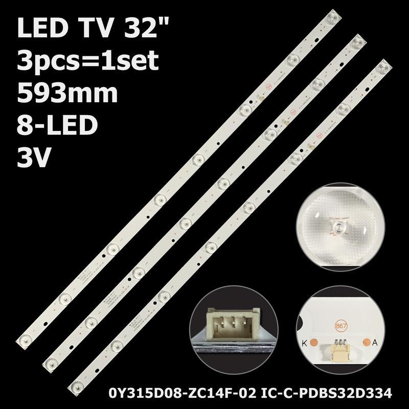 Кілька примірників у наявності Артикул: ART-12172 Ціна за комплект з 3-х планок Тип підкладки: алюміній Довжина планок: 593 мм Ширина планок: 17 мм Напруга одного світлодіода: 3V Кількість контактів на роз'ємі: 3 pin Кількість світлодіодів на планці: 8 LED Відстань між світлодіодами по центру: 74-88-88-72-88-88-74 мм Маркування планок: 0Y315D08-ZC14F-02 303WY315031 IC-C-PDBS32D334 Підсвітка підійде до моделей: - Panda: LE32D51A LE32D31S - Bravis: LED-32D66 - Ergo: LE32D5 Аналоги планок: 303JK315034, 7.03. F. 58017GST2R, CJ 1.30.1.580012013 УВАГА: Перед продажем перевіряється кожна планка на працездатність спеціальним тестером. Настійно не рекомендується перевіряти світлодіодні лінійки пристроями, які безпосередньо не призначені для цього. У нас ви можете замовити пристрій для перевірки працездатності підсвічування LED підсвітки Довжина одної планки (мм): 593 Діагональ (дюйми): 32" Загальна довжина планок (мм.): Використовується одна суцільна планка Кількість LED діодів на планці (шт.): 8 Кількість планок в комплекті (шт): 3 Матеріал основи планки: алюміній Напруга одного LED діода: 3V Термоскотч на планках: відсутній