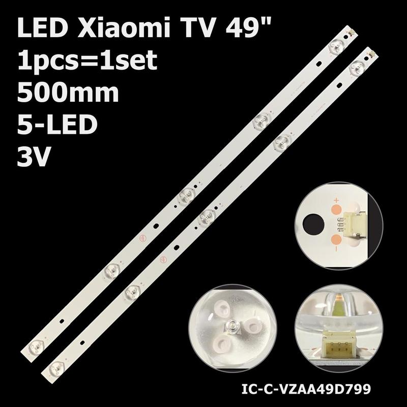Артикул: ART-11679 Ціна за комплект з 1-ї планки Тип підкладки: алюміній Довжина планок: 500 мм Ширина планок: 17 мм Напруга одного світлодіода: 3V Кількість контактів на роз'ємі: 3 pin Кількість світлодіодів на планці: 5 LED Відстань між світлодіодами по центру: 115 мм Маркування планок: IC-C-VZAA49D799 Підсвітка підійде до моделей: - Xiaomi: L49M5-AZ, MI49TV(M49) УВАГА: Перед продажем перевіряється кожна планка на працездатність спеціальним тестером. Настійно не рекомендується перевіряти світлодіодні лінійки пристроями, які безпосередньо не призначені для цього. У нас ви можете замовити пристрій для перевірки працездатності підсвічування LED підсвітки