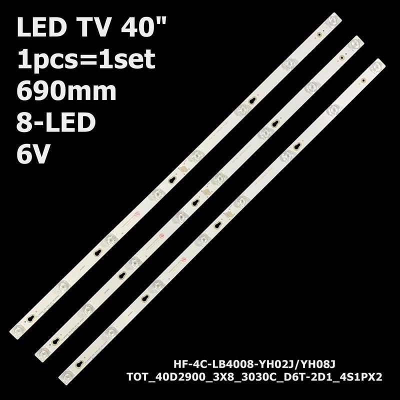 Артикул: ART-12340 Ціна за 1 планку Тип підкладки: алюміній Довжина планок: 690 мм Ширина планок: 18 мм Напруга одного світлодіода: 6V Кількість контактів на роз'ємі: 4 pin Кількість світлодіодів на планці: 8 LED Відстань між світлодіодами по центру: 93-99-99-84-99-99-93 мм Маркування планок: - TOT_40D2900_3X8_3030C_D6T-2D1_4S1PX2 REV.V3 (T**********_3030C_D6T-2D1_4S1PX2 REV.V3) - YHF-4C-LB4008-YH06J Підсвітка підійде до моделей: - TCL: L40P1A-F, L40F1B, L40P1A-F, L40E5800A-UA, L40P2-UD, L40F3303B, L40F3800A, 40HR, 40A730U, 40D2900, 40DS500, 40FC3206X1, 40L2600, 40S305, 40S426, 40S4900, F40D4021, F40D4026, F40S5916, L40D2900F, L40E5800A, L40F2B, L40F33, L40F3301B, L40P1AF, L40P2UD, L40S4900, LED40D2900, LED40D2900AS, LED40D2900S, LED40D2930, F40S5916 40S305, L40P3UD0, L40F5B - Thomson: 40FB5426, 40FB5446, 40FC3201, 40FC3206, 40FC3221, 40FD5406, 40FD5416, 40FD5426, 40FS3000 - Hitachi: CDH-LE40SMART10 - RCA: L40NXSMART, X40SM та інші. Аналоги планок: - 40HR330M08A6 - 40HR330M08A6 V8 - TOT_40D2900 - TOT-40D2900-3X8-3030C - TOT_40D2900_3x8_3030C - TOT_40D2900_3X8_3030C_d6t_2d1_4S1PX2 - TOT_40D2900_3x8_3030c_D6T-2D1_4S1PX2 REV.V33 - T**********_3030c_D6T-2D1_4S1PX2 REV.V3 - TOT_40D2900_3x8_3030C_D6T-2D1_4S1PX2 REV.V3 - JL.D40042330-004ES-M - 4C-LB4008-YH02J - 4C-LB4008-YH05J - 4C-LB4008-YH08J - 4C-LB4008-HR01J - 4C-LB4008-PF01J - YHA-4C-LB4008-YH07J - YHB-4C-LB4008-YH02J - YHB-4C-LB4008-YH05 - YHF-4C-LB4008-YH06J - 40D2006V2W4C1Bx2-69018M Підсвічування матриці (панелі): - LVF395ND1L - LVF400SS0T УВАГА: Перед продажем кожна планка пройшла перевірку своєї працездатності за допомогою спеціального тестера. Наголошуємо, що не рекомендується використовувати пристрої, які не призначені для цього, для перевірки світлодіодних лінійок. В нашому асортименті є спеціальні пристрої, призначені саме для перевірки працездатності LED-підсвітки. Також рекомендуємо перевірити довжину планок, відстань між центрами лінз, які зазначені в описі товару, а також переконатися, що конектор для підключення відповідає фото і візуальному розташуванню отворів для кріплення. Варто зазначити, що на одному телевізорі можуть бути встановлені різні види планок, а також відстань між центрами лінз може не збігатися, особливо для деяких бюджетних моделей телевізорів.