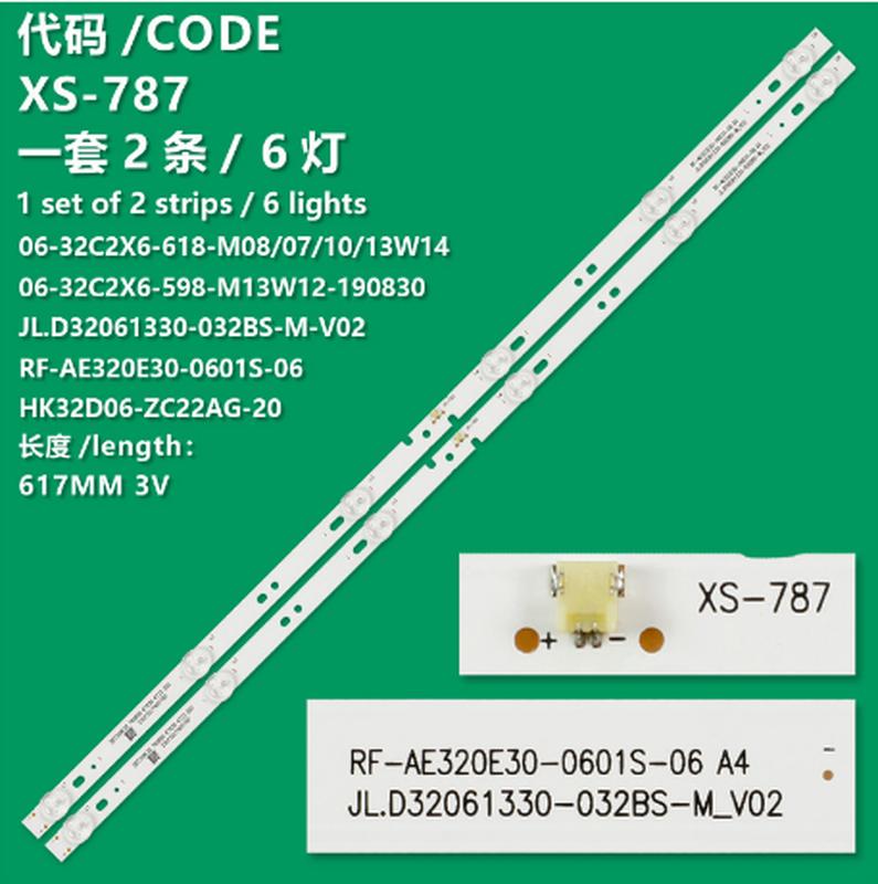 Тип підкладки: алюміній Довжина планок: 618 мм Ширина планок: 14 мм Напруга одного світлодіода: 3V Кількість контактів на роз'ємі: 2 pin Кількість світлодіодів на планці: 6 LED Відстань між світлодіодами по центру: 110-125-110-125-110 мм Маркування планок: - RF-AE320E30-0601S-06 A4 - JL.D32061330-032BS-M V02 (JL.D32061330-032BS-M_V02) Підсвітка підійде до моделей: - Akai: AKTV3213 TS, AKTV3223 T Smart, AKTV3227H - Changhong: 32D2060GA - Element: ELEFW328-H, ELST3216H - Fusion: FLTV-32L32, FLTV-32H110T, FLTV-32H100 - Haier: 32K31A, 32K32A, LE32A31H, LE32A31N, LE32G310Z, LE32U3000 - Harper: 32R470T, 32R575T, 32R660TS - JVC: LT-32K383, LT-32C485 - Konka: KKTV-K32C - Nordmende: ND32S3100H - Orion: OLT-30100, OLT-32500, OLT-32502, OLT-32702 - Philco: PH32C10, PH32C10DSGWA, PTV32C30D, PTV32C30 - Profilo: 32PA200E - Proscan: PLDED3273A, PLDED3273A-B - Skyline: 32YT5900, 32YST5970 - Supra: STV-LC32ST2000W - Xiaomi: L32M6-ES, MI32TV-JY, - Hyundai: H-LED43ET3000 Аналоги планок: - JL.D32061330-032BS-M V01, (JL.D32061330-032BS-M_V01) - HK32D06-ZC22AG-20 - RF-BS430S30-0601S - YF-K02L004HMXD-0001 - YF-K52K003JA8D-0001 - YF-K**********, PN:19092101002 - 06-32C2X6-618-M08W14 - 06-32C2X6-618-M07W14 - 06-32C2X6-618-M10W14 - 06-32C2X6-618-M13W14 - **********W14 - 303HK320056, 19092101002, 230101009640, 261501000710, 2301032C900010, 230132C1N00160, 230132C1N********** N180707, T409 230101011210, 3AS6CX62014, 6501L618000020, 6501L618000030 230132C1N00270 YF-J02L003HKGD-0002 6501L618000020 Підсвічування матриці (панелі): - HK315LEDM-0HNBH - HK315LEDM-JH36H - HK315LEDM-JH65H - PT320AT01.1 VER 1.0 - HK315LEDM-JH52H