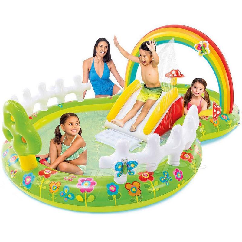 Детский бассейн с горкой и фонтаном представляет собой надувной игровой центр для детей, который состоит из двух бассейнов и станет отличным решением для дома или дачи. Размеры надувного игрового бассейна позволяют развлекаться сразу нескольким детям. В центре комплекса находится мягкая горка с бортиками, которую орошает водичкой встроенный в радугу фонтанчик. Восторг малыша, съезжающего по отлично скользящей поверхности, на этом не заканчивается. Детский игровой бассейн самое подходящее место, попрыгать ребенку достаточно держаться за надувной забор или деревце, а еще можно поохотиться за надувными бабочками и собрать яркие грибы. Это то самое место, где можно дотянуться до радуги и веселиться под теплым летним дождиком на радость родителям. В комплекте: бассейн, 2 надувных грибочка, 4 надувные бабочки и 3 мяча. Объем: 450 л при наполнении на 80%. Материал: винил, толщина 0.30 мм. Удобный сливной клапан. Дно не надувное. Максимальная нагрузка - 54 кг. Высота бортиков 13 см. Размер 290 * 180 * 104 см. Размер коробки 48 * 13 * 41 см.