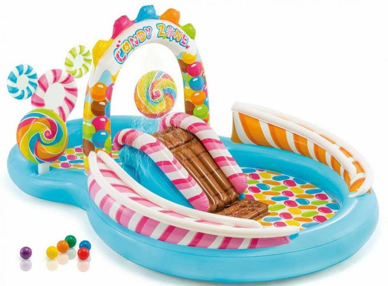 Водний ігровий центр Карамель складається з двох невеликих басейнів глибиною 14 см. Перший вміщує 206 л, другий 168 л. У комплекті до нього йдуть 2 надувні окремі льодяники та 6 м'ячиків, якими можна грати й поза надувним центром. До центру можна увімкнути садовий шланг, щоб працювали розбризкувачі. Швидко злити воду допоможе зливальний клапан. Центр із надувним дном виготовлений із ПВХ товщиною 0,30 мм. Максимальне припустиме навантаження 81 кг. Загальна місткість: 374 л